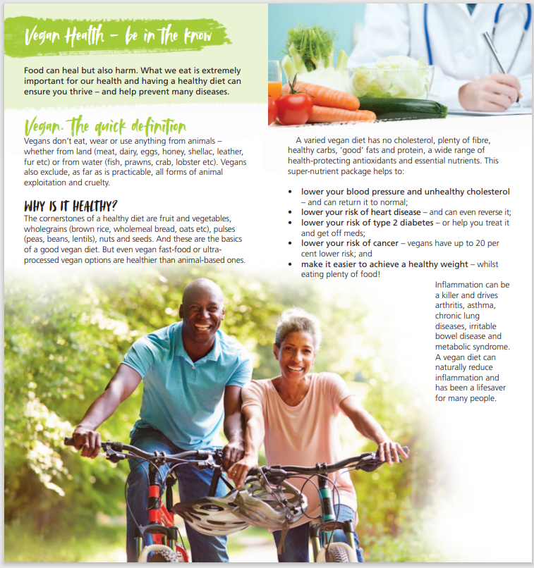 This handy leaflet explains what a vegan is and why a plant-based diet is the healthiest. It explains why meat and animal products are harmful. It is brimming with examples of rich sources of nutrients and says where to get them. Great for stalls and outreach.
