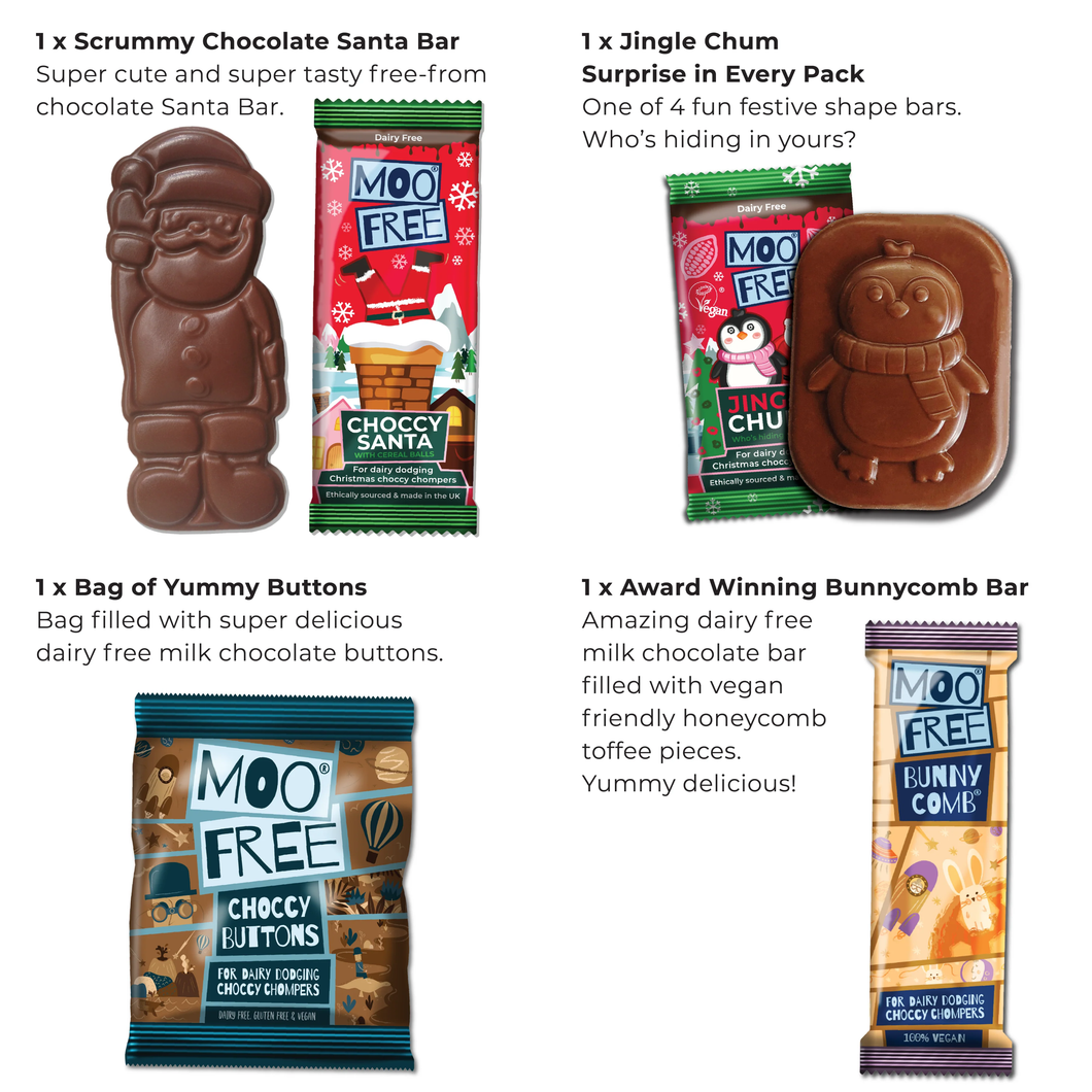 Their Santa with crunchy cereal balls is made with the same multi award-winning, dairy-free chocolate that’s smooth, creamy, and full of Moo Free magic. You’ll also find their much-loved choccy buttons, bursting with that classic dairy-free creaminess. The Jingle Chum adds a little surprise and fun — who will you discover in yours? And to top it all off, they've included their bestselling Bunnycomb bar for the ultimate festive treat.