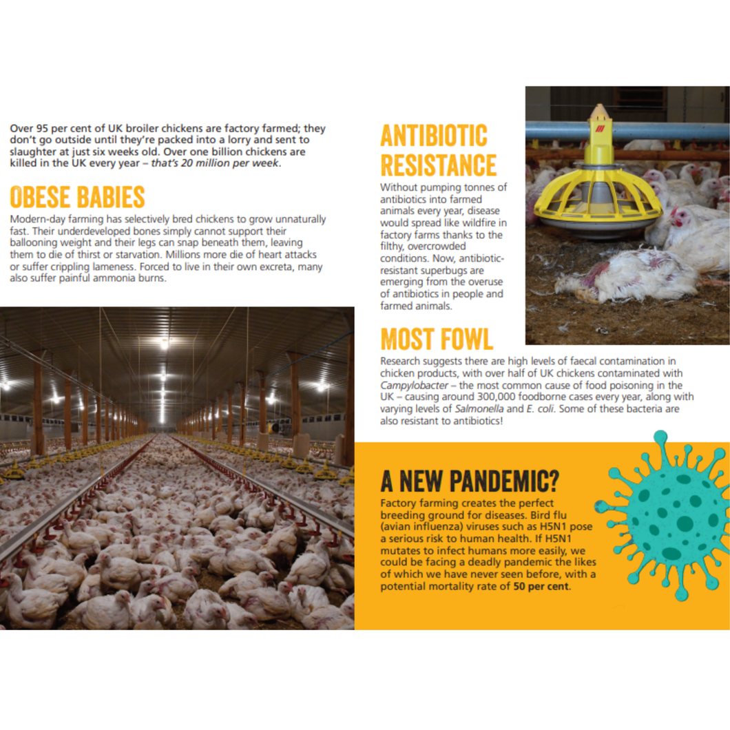 Over 95 per cent of UK broiler chickens are factory farmed; they don’t see the light of day until they’re packed into a lorry and sent to slaughter at just six weeks old. Over one billion chickens are killed in the UK every year – that’s 20 million per week.
